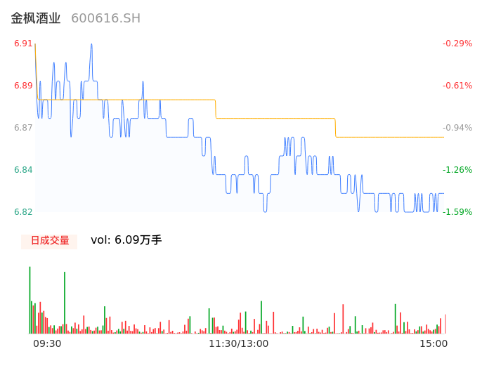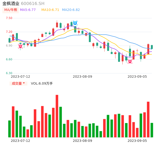 09月05日,金枫酒业收报6.83,股价涨幅-1.44%,成交金额4178.25万元,换手率0.91%。