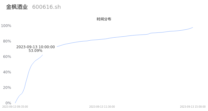 600616金枫酒业2023年09月13日成交35.78万手,成交金额2.51亿元,相较昨日放量30.65万手,换手率5.35%,成交清淡。