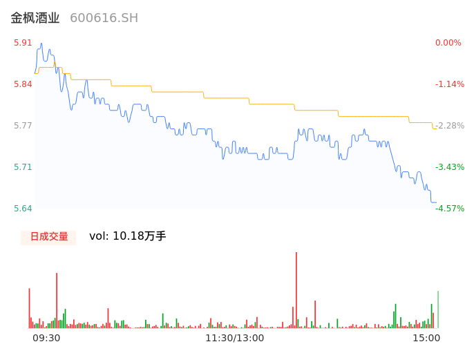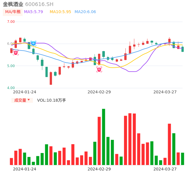 03月27日,金枫酒业收报5.64,股价涨幅-4.57%,成交金额5875.80万元,换手率1.52%。