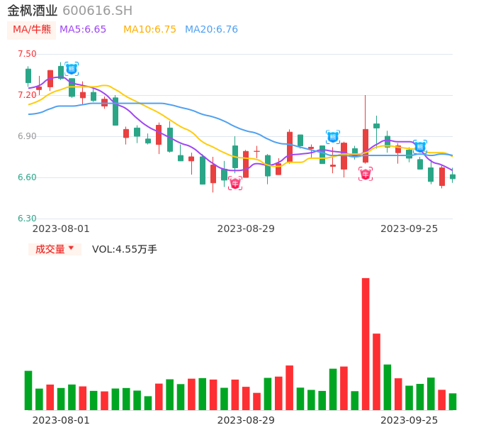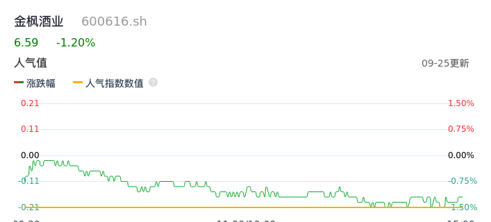 09月25日,金枫酒业收报6.59,股价涨幅-1.20%,成交金额3005.39万元,换手率0.68%。