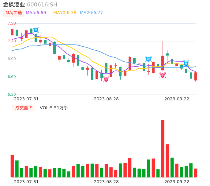 09月22日,金枫酒业收报6.67,股价涨幅1.52%,成交金额3647.44万元,换手率0.82%。