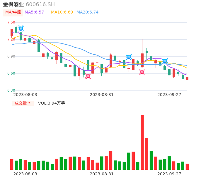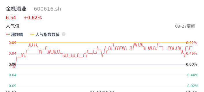 09月27日,金枫酒业收报6.54,股价涨幅0.62%,成交金额2573.56万元,换手率0.59%。