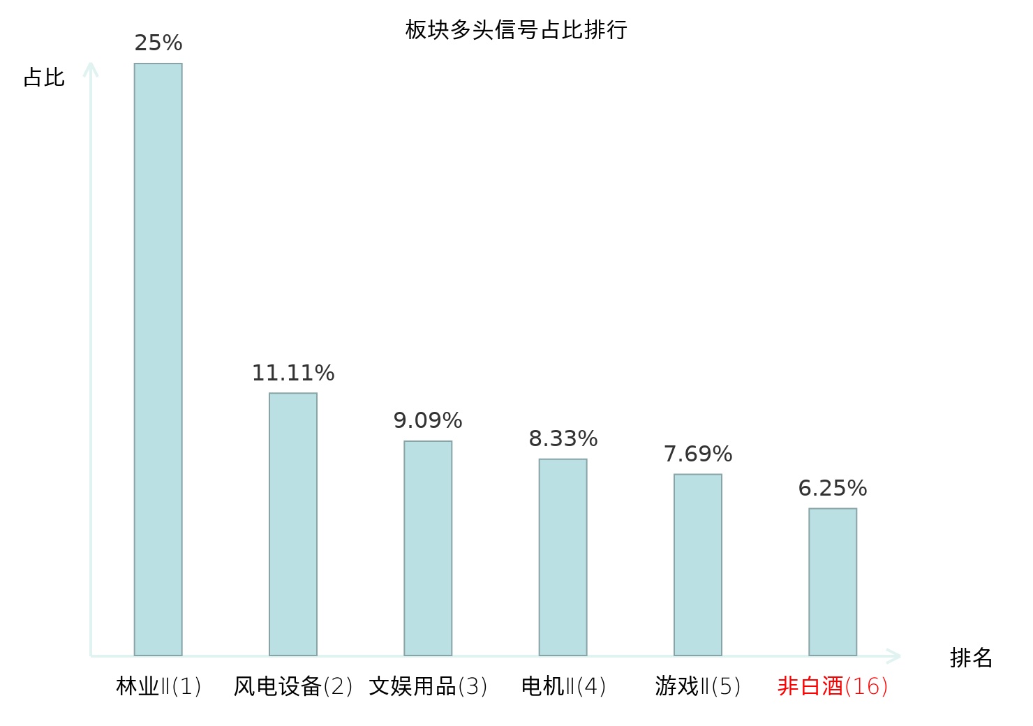 全市场所有行业板块中主力多头信号占比排名中,林业Ⅱ板块位居第一。林业Ⅱ板块名次提升最快,较昨日上升124位。