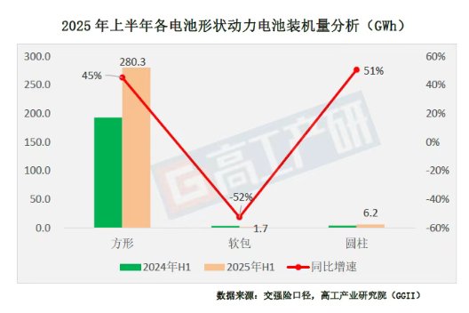 从不同电池形状来看,2025年上半年方形动力电池装机量约280.3GWh,同比增长45%;软包动力电池装机量约1.7GWh,同比下降52%;圆柱动力电池装机量约6.2GWh,同比增长51%。