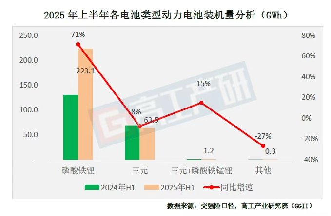 从装机量电池类型来看,2025年上半年磷酸铁锂动力电池装机量约223.1Wh,同比增长71%,份额占比77.4%,较去年同期上升12.5个百分点;三元动力电池装机量约63.5GWh,同比下降8%;三元+磷酸铁锰锂装机约1.2GWh,同比增长15%。