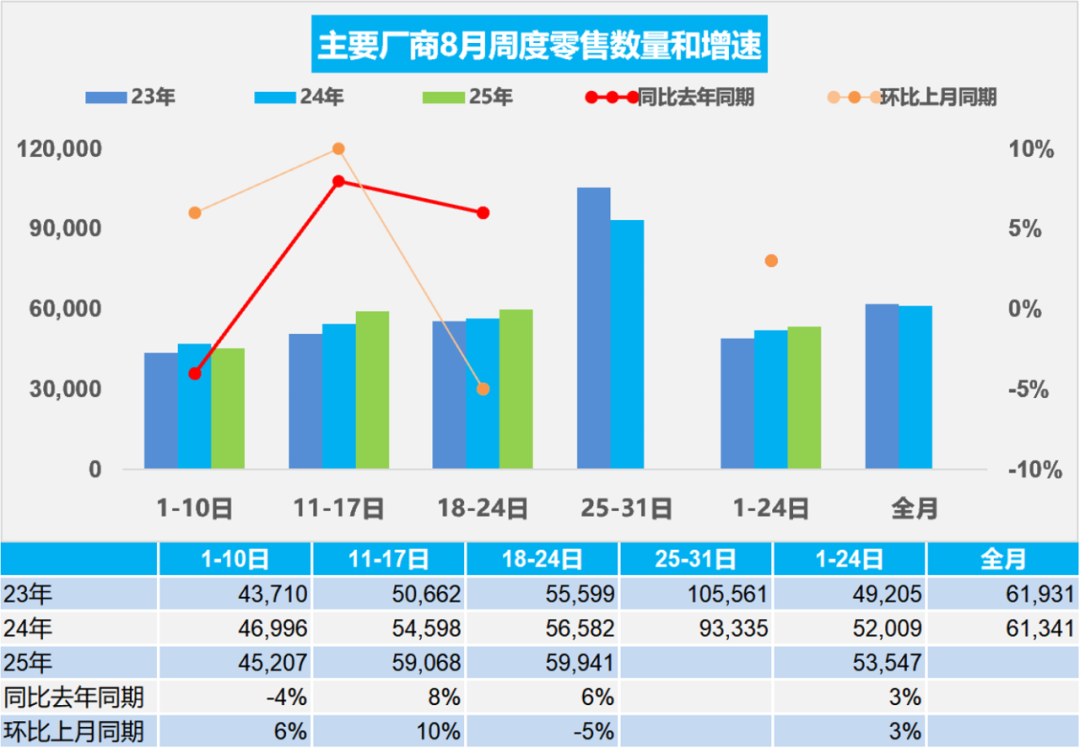 8月第三周全国乘用车市场日均零售6.0万辆,同比去年8月同期增长6%,较上月同期下降5%。