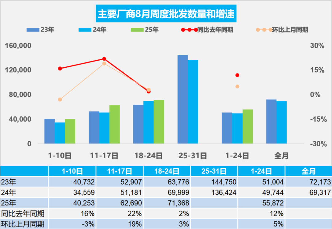 8月1-24日,全国乘用车厂商批发134.1万辆,同比去年8月同期增长12%,较上月同期增长5%;今年以来累计批发1686.6万辆,同比去年增长13%。