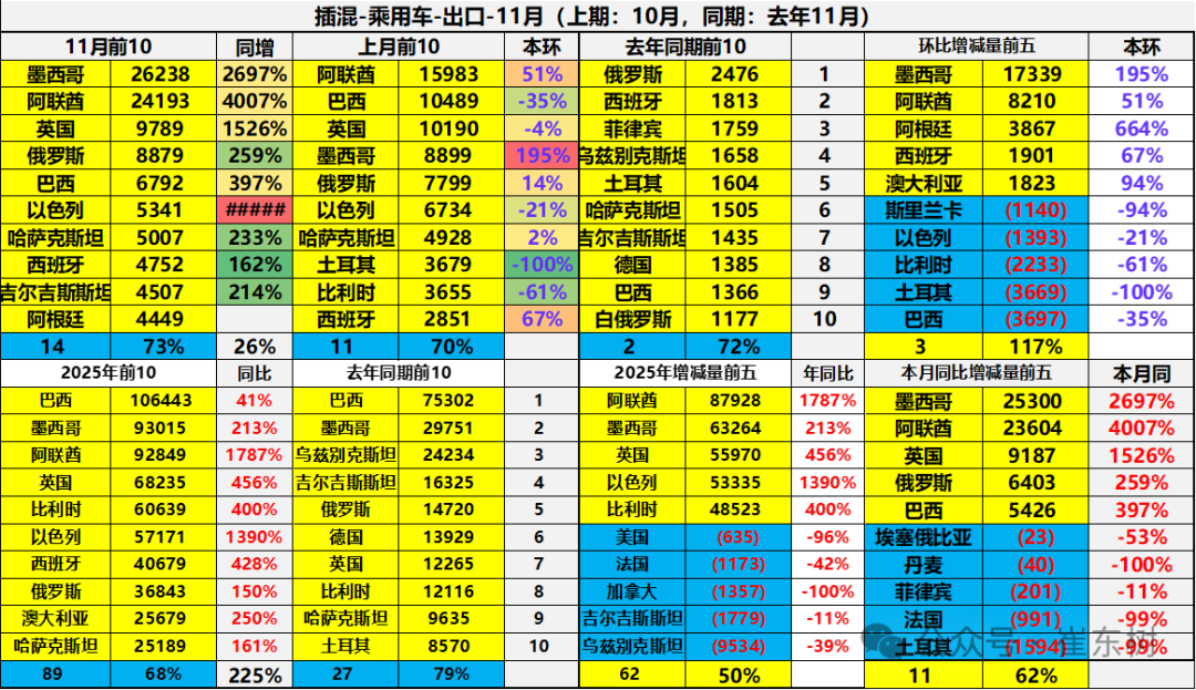 2025年11月出口插混乘用车的主要是墨西哥26238辆、阿联酋24193辆、英国9789辆、俄罗斯8879辆、巴西6792辆、以色列5341辆、哈萨克斯坦5007辆、西班牙4752辆、吉尔吉斯斯坦4507辆、阿根廷4449辆,其中本期较同期增量增大的前五个是:墨西哥25300辆、阿联酋23604辆、英国9187辆、俄罗斯6403辆、巴西5426辆。