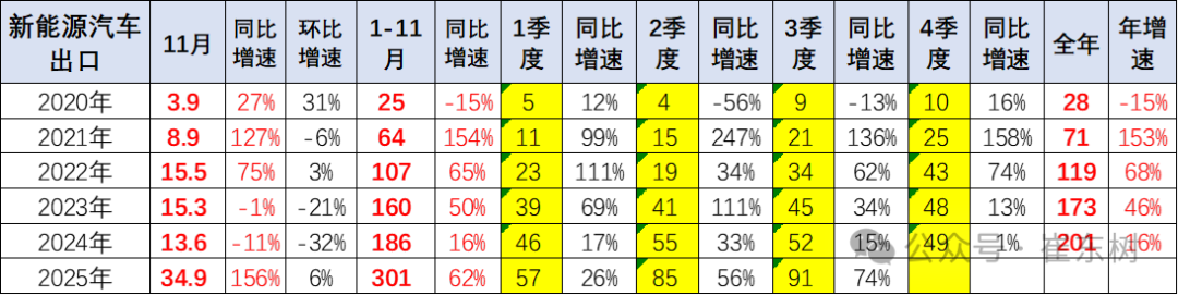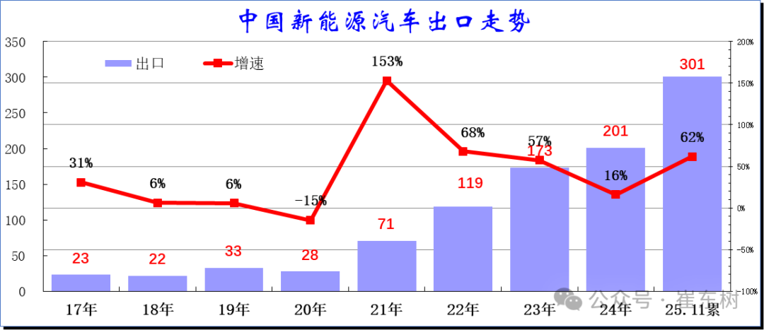 在连续高增长后,2024年全年新能源汽车累计出口量201万辆,同比增长16%。2025年11月中国新能源汽车出口35万辆,同比增长156%,表现很好;2025年1 - 11月新能源汽车出口量301万辆,同比增长62%,增速高于2024年1-11月的16%较多。