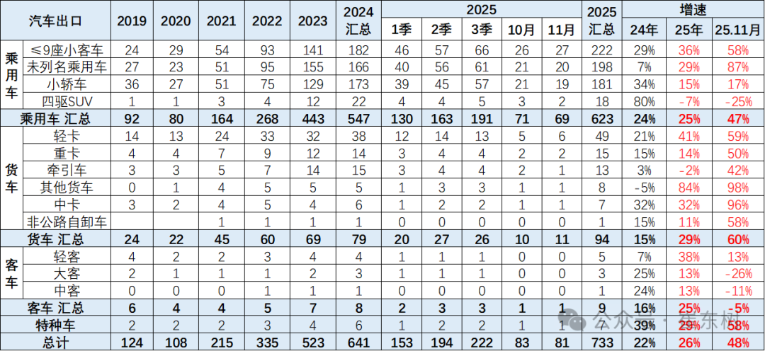 2025年1-11月中国汽车实现出口733万辆,同比2024年1-11月增速25%,11月中国汽车实现出口81万辆,同比增48%,环比降2%,同比和环比走势总体较强。今年的主要动力仍是中国产品竞争力提升和全球南方国家市场的小幅增长,但俄罗斯车市低迷的影响较大。