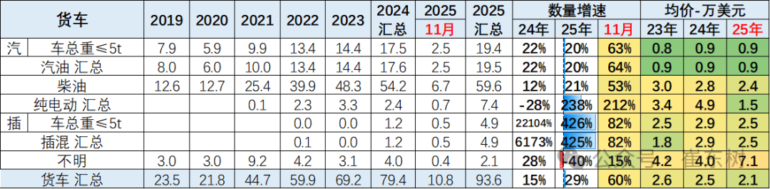 货车市场出口近几年增速不强,在汽车出口市场占比表现处于持续小幅萎缩状态,但2025年因纯电动和插混表现较强。