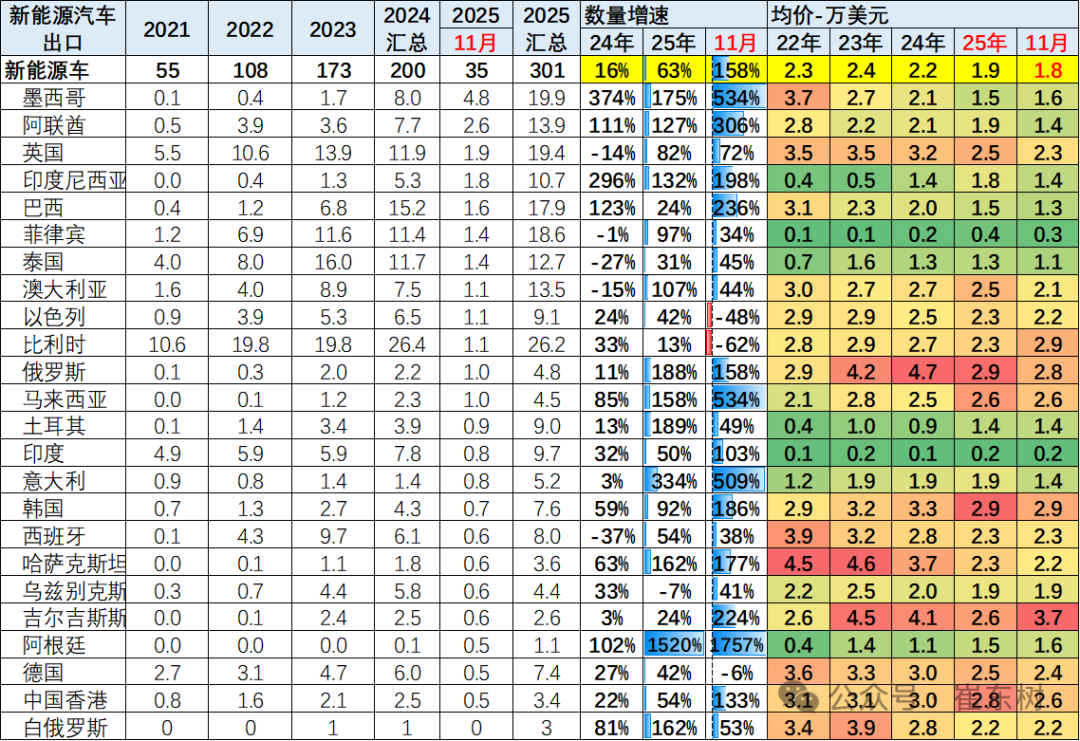 2025年11月中国新能源汽车出口总量的前10国家:墨西哥48172辆、阿联酋25895辆、英国19191辆、印度尼西亚18337辆、巴西15709辆、菲律宾14486辆、泰国14420辆、澳大利亚10908辆、以色列10905辆、比利时10809辆,其中本期较同期增量增大的前五个是:墨西哥44295辆、阿联酋19648辆、英国14132辆、印度尼西亚13888辆、巴西10922辆。