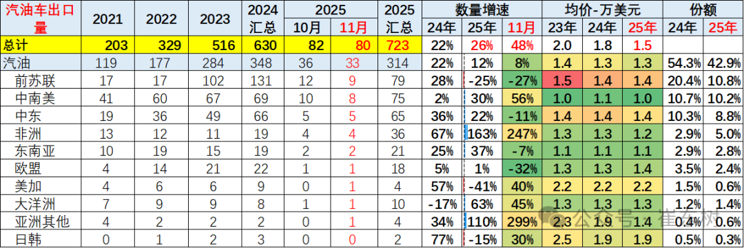 2024年全年中国汽油车型出口348万辆、增22%;2025年1-11月中国汽油燃油车出口314万辆、增12%。今年中国对俄罗斯、美国、日韩的燃油车市场下滑巨大,其它市场总体还是很好的,尤其是非洲、中东、东南亚等市场的燃油车出口多,合资出口返销特色明显。