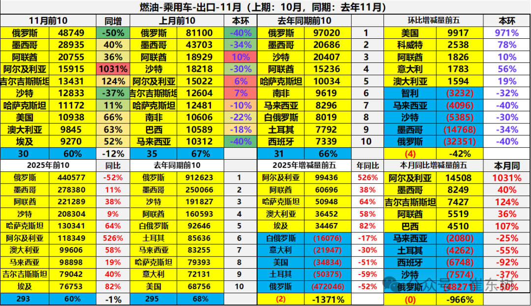 中国燃油乘用车2025年11月出口规模最大的是俄罗斯48749辆、墨西哥28935辆、阿联酋20755辆、阿尔及利亚15915辆、吉尔吉斯斯坦13431辆、沙特12833辆、哈萨克斯坦11172辆、美国10938辆、澳大利亚9845辆、埃及9270辆,其中本期较同期增量增大的前五个是:阿尔及利亚14508辆、墨西哥8249辆、吉尔吉斯斯坦7427辆、阿联酋5519辆、巴西4510辆。