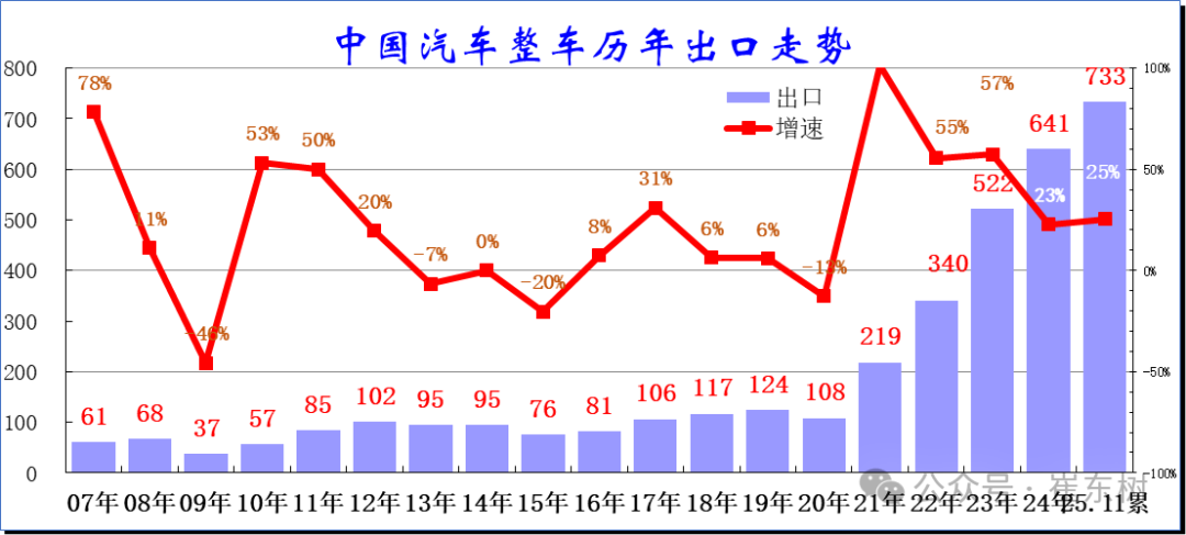 中国汽车出口自2021年突破百万量级后持续高增长(2021年增102%,2022-2023年增50%+,2024-2025年增速回落至20%左右),2025年1-11月出口733万辆(同比2024年1-11月增25%),延续增长态势。近期中国汽车出口呈现超高速增长态势,未来只要国际市场环境稳定,中国汽车出口发展仍具有巨大空间。