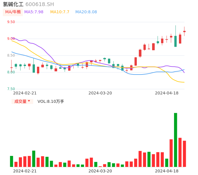 04月18日,氯碱化工收报9.23,股价涨幅1.21%,成交金额7456.62万元,换手率1.08%。