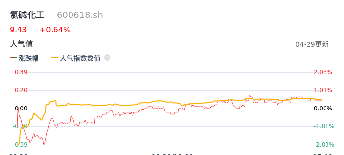 04月29日,氯碱化工收报9.43,股价涨幅0.64%,成交金额6202.60万元,换手率0.89%。