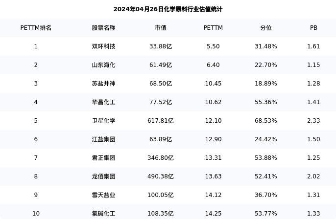 从估值角度看:氯碱化工最新市盈率PETTM为14.25,在行业内排名10/55,处于53.77分位。