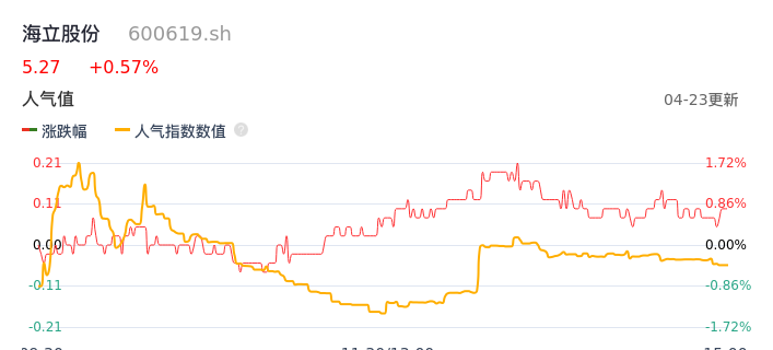04月23日,海立股份收报5.27,股价涨幅0.57%,成交金额3458.46万元,换手率0.83%。