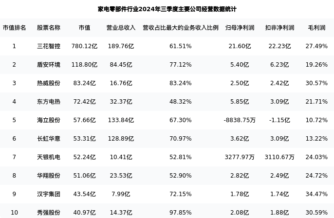 海立股份最新报告期数据为三季度,下表汇总了家电零部件行业内市值靠前的公司三季度主要经营数据