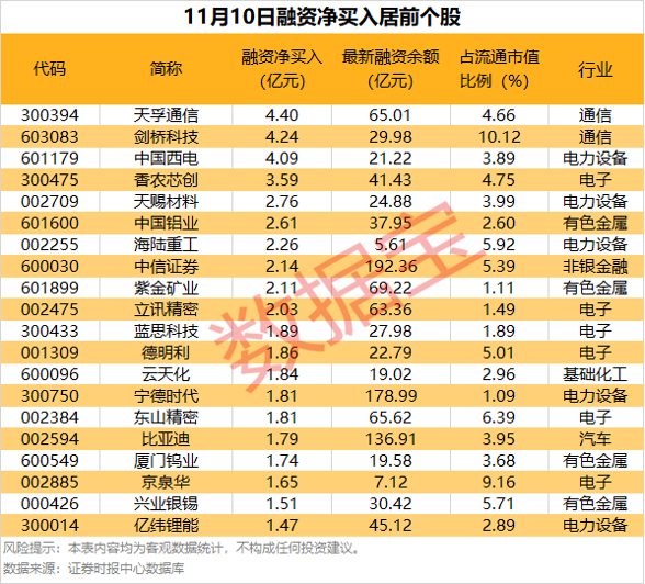 具体到个股,11月10日获融资净买千万元以上的有568只,其中46股融资净买入额均超1亿元。