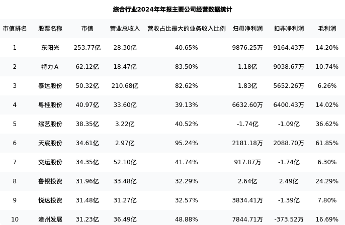 天宸股份最新报告期数据为年报,下表汇总了综合行业内市值靠前的公司年报主要经营数据