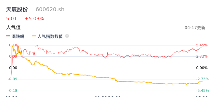 04月17日,天宸股份收报5.01,股价涨幅5.03%,成交金额9143.30万元,换手率2.70%。