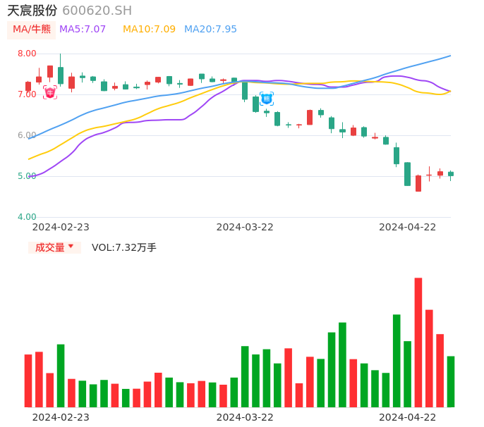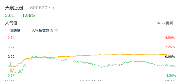 04月22日,天宸股份收报5.01,股价涨幅-1.96%,成交金额3671.56万元,换手率1.07%。