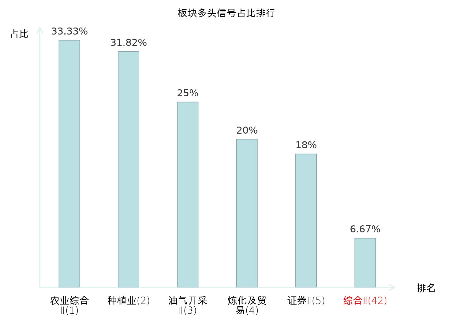 全市场所有行业板块中主力多头信号占比排名中,农业综合Ⅱ板块位居第一。农业综合Ⅱ板块名次提升最快,较昨日上升127位。