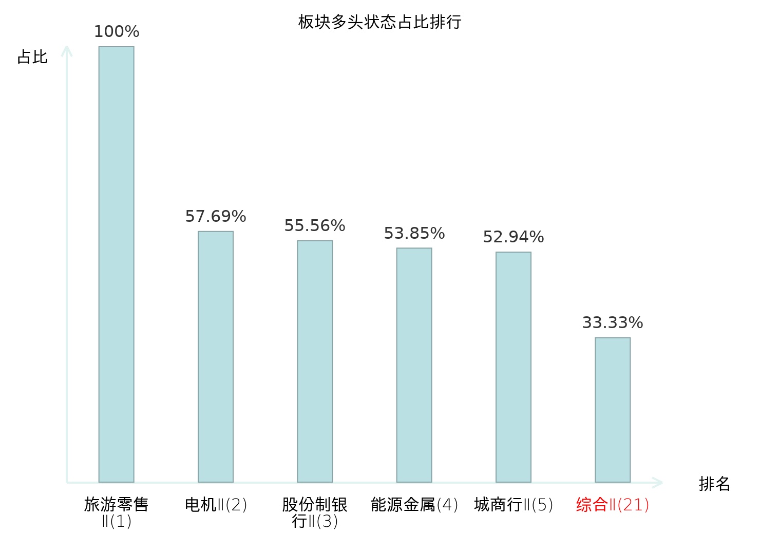 全市场所有行业板块中主力多头状态占比排名中,旅游零售Ⅱ板块位居第一。地面兵装Ⅱ板块名次提升最快,较昨日上升99位。