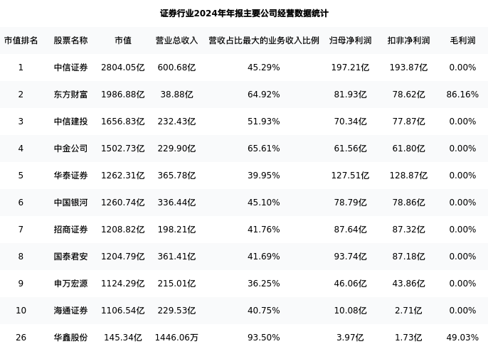 华鑫股份最新报告期数据为年报,下表汇总了证券行业内市值靠前的公司年报主要经营数据