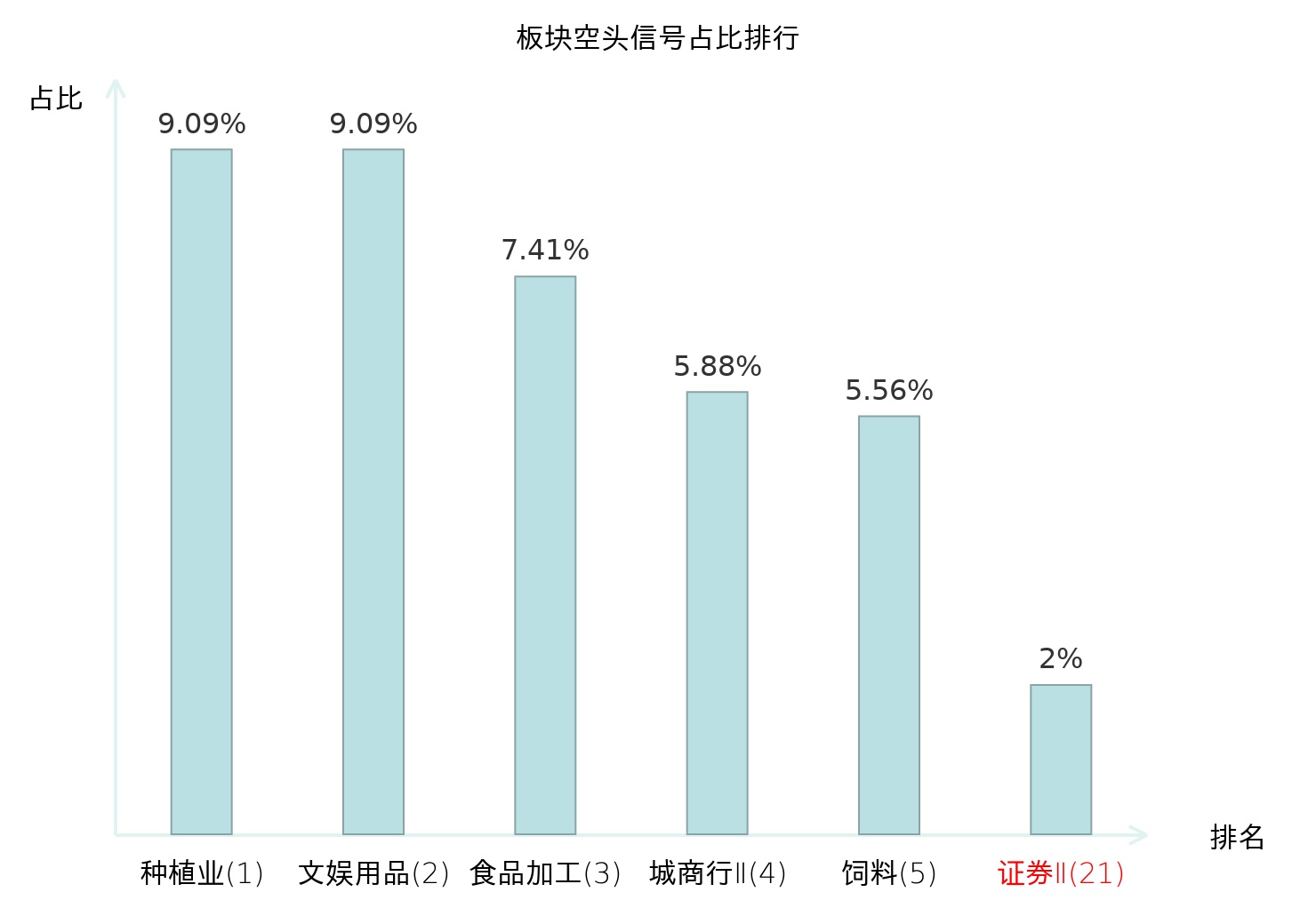 全市场所有行业板块中主力空头信号占比排名中,种植业板块位居第一。文娱用品板块名次提升最快,较昨日上升112位。