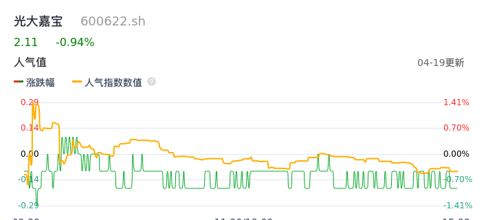 04月19日,光大嘉宝收报2.11,股价涨幅-0.94%,成交金额1790.92万元,换手率0.56%。
