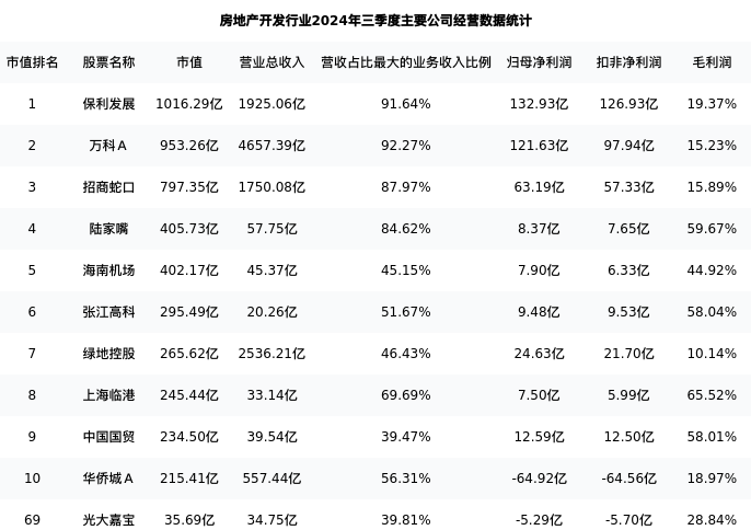 光大嘉宝最新报告期数据为三季度,下表汇总了房地产开发行业内市值靠前的公司三季度主要经营数据
