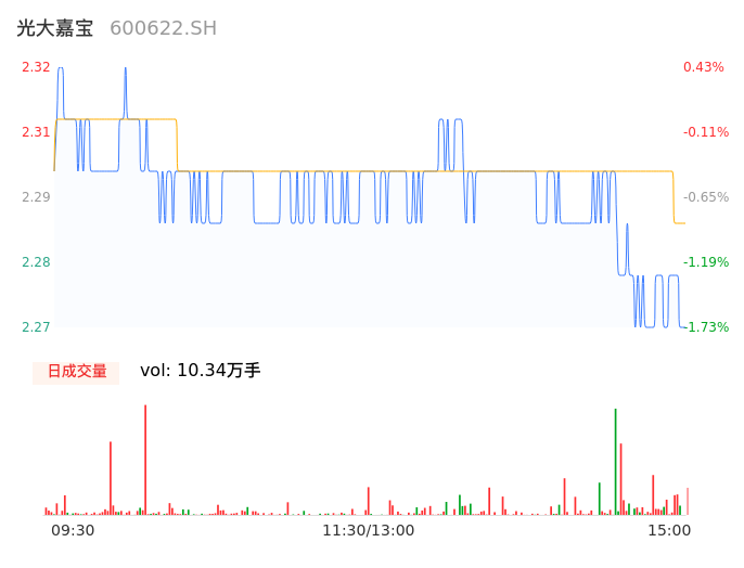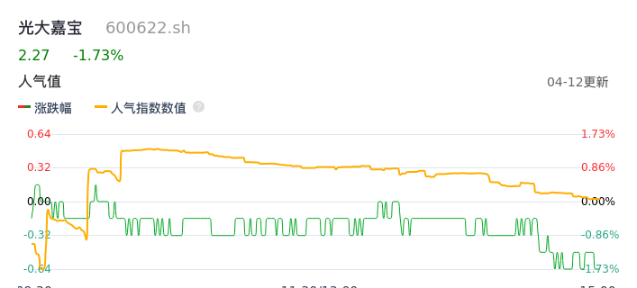 04月12日,光大嘉宝收报2.27,股价涨幅-1.73%,成交金额2370.26万元,换手率0.69%。
