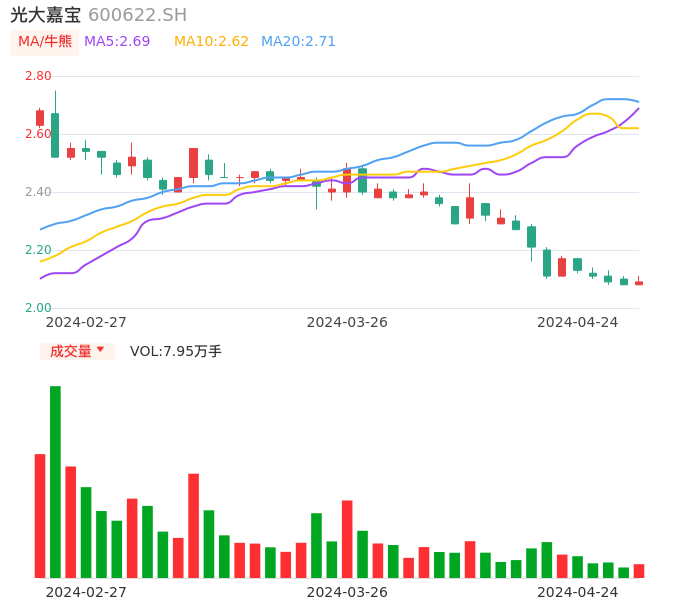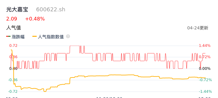 04月24日,光大嘉宝收报2.09,股价涨幅0.48%,成交金额1662.18万元,换手率0.53%。