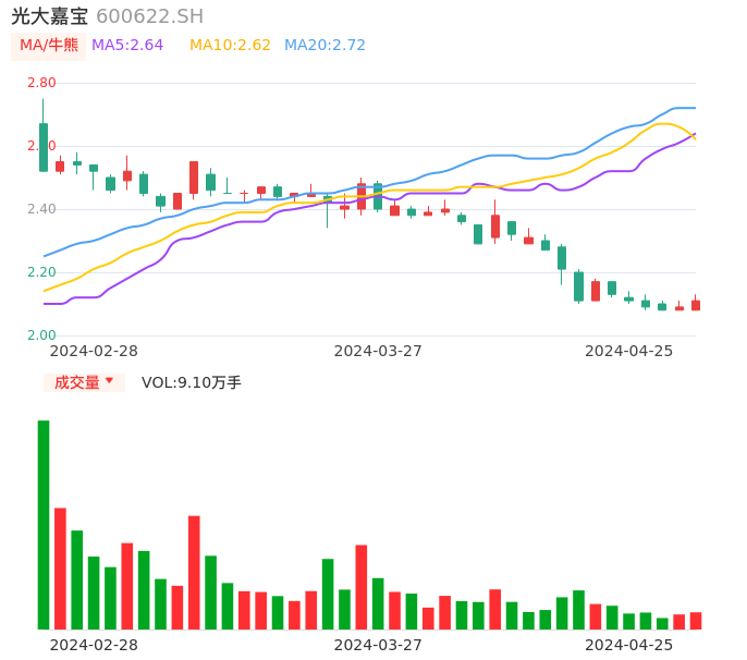 04月25日,光大嘉宝收报2.11,股价涨幅0.96%,成交金额1919.66万元,换手率0.61%。