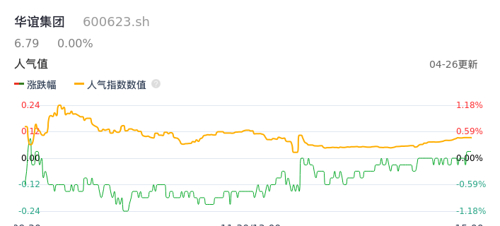 04月26日,华谊集团收报6.79,股价涨幅0.00%,成交金额7756.65万元,换手率0.62%。