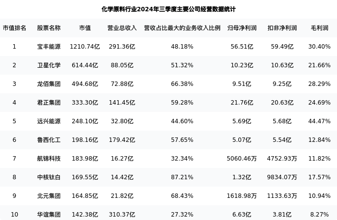 华谊集团最新报告期数据为三季度,下表汇总了化学原料行业内市值靠前的公司三季度主要经营数据