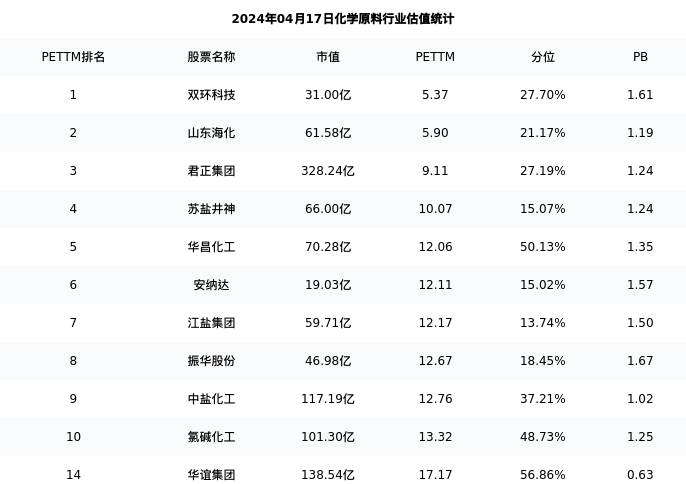 从估值角度看:华谊集团最新市盈率PETTM为17.17,在行业内排名14/55,处于56.86分位。