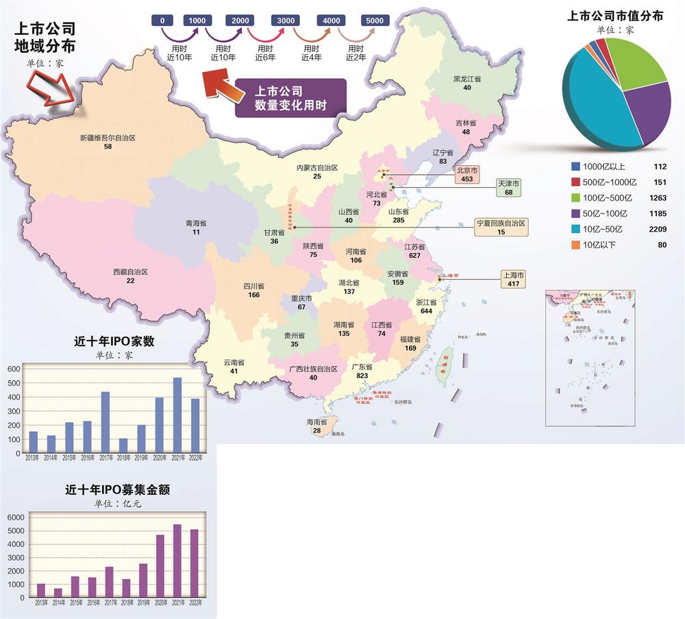 A股存量公司突破1000家(2000年9月)和2000家(2010年9月)大关,均用了10年时间;“十三五”期间,A股上市公司数量相继跨越3000、4000两个千级门槛,用时缩短到6年和4年;5000家整数关口的突破,正在我国开启全面建设社会主义现代化国家新征程、向第二个百年奋斗目标进军的“十四五”实现,用时仅为两年。
