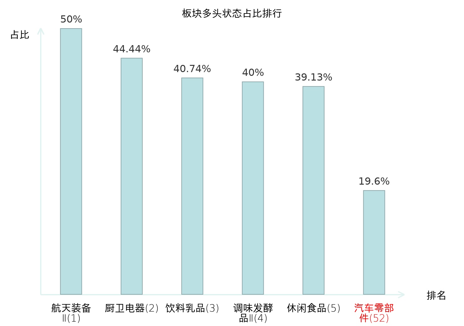全市场所有行业板块中主力多头状态占比排名中,航天装备Ⅱ板块位居第一。林业Ⅱ板块名次提升最快,较昨日上升92位。