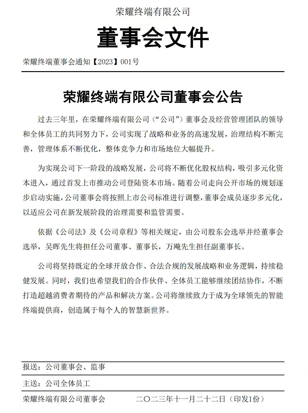 11月22日晚间,荣耀终端有限公司董事会发布公告,表示依据《公司法》及《公司章程》等相关规定,由公司股东会选举并经董事会选举,吴晖先生将担任公司董事、董事长,万飚先生担任副董事长。