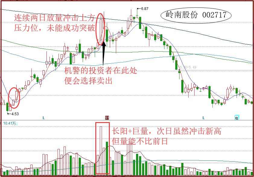 岭南股份图示位置左侧出现买点,在股价上涨拉升过程中,股价长阳创近期新高,且下方放出巨量,此时很容易理解成放量上涨,但需要注意上方仍有半年线压力,且后一个交易日股价冲高也并未突破阻力,量能也有所萎缩,此时便出现第一个卖点。如果没有把握住,也可根据“三七战法”在次日开盘后卖出。