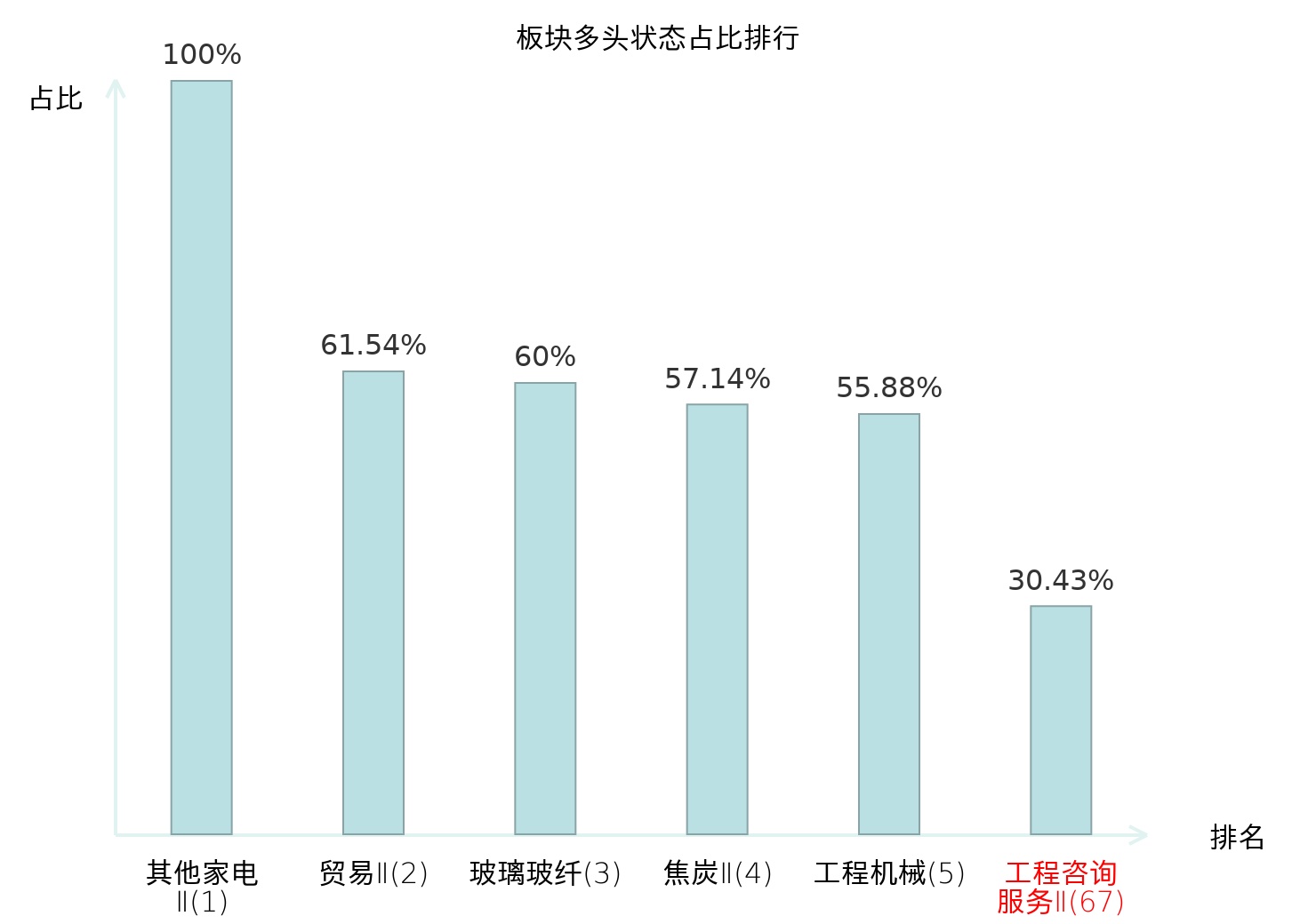全市场所有行业板块中主力多头状态占比排名中,其他家电Ⅱ板块位居第一。航海装备Ⅱ板块名次提升最快,较昨日上升98位。