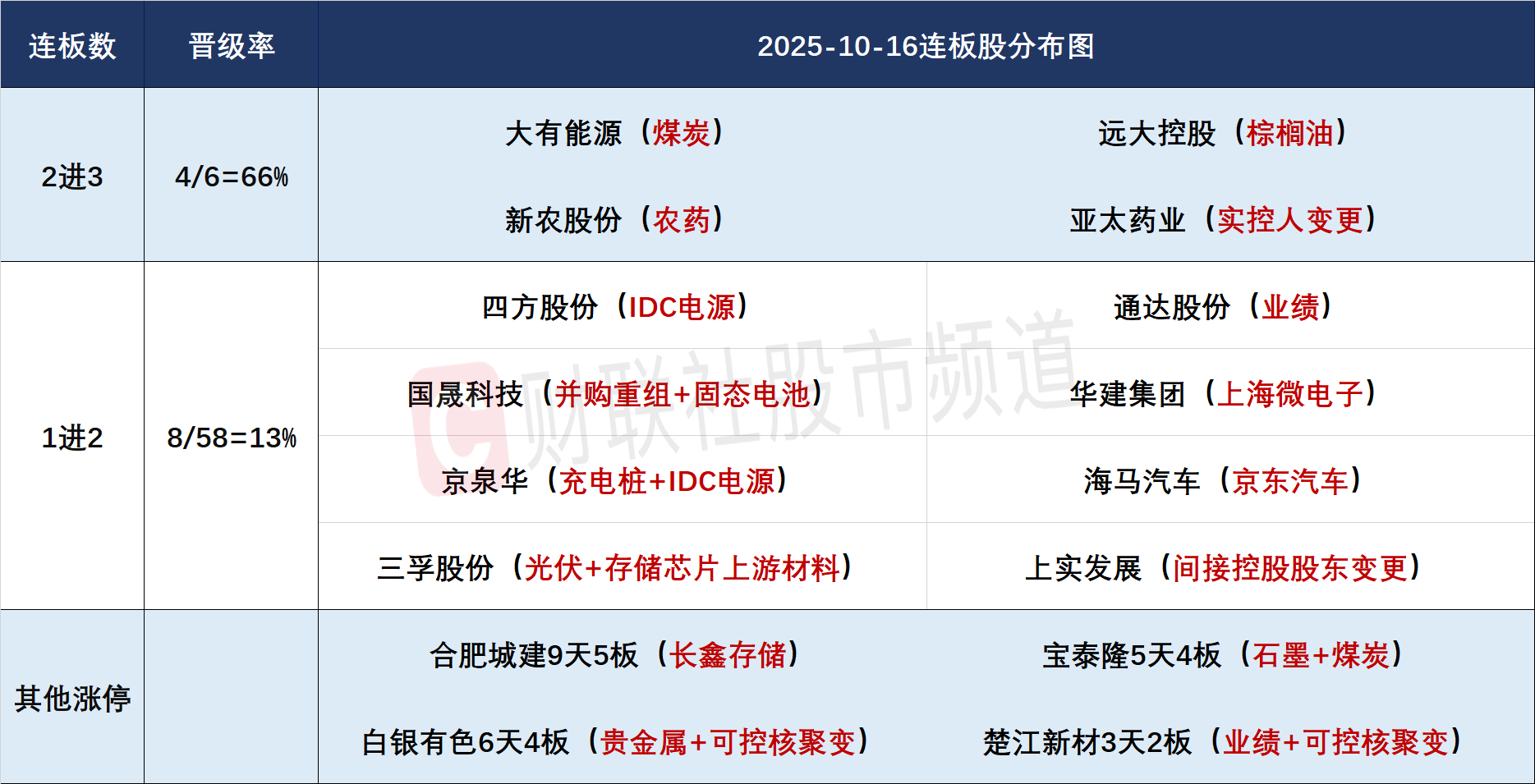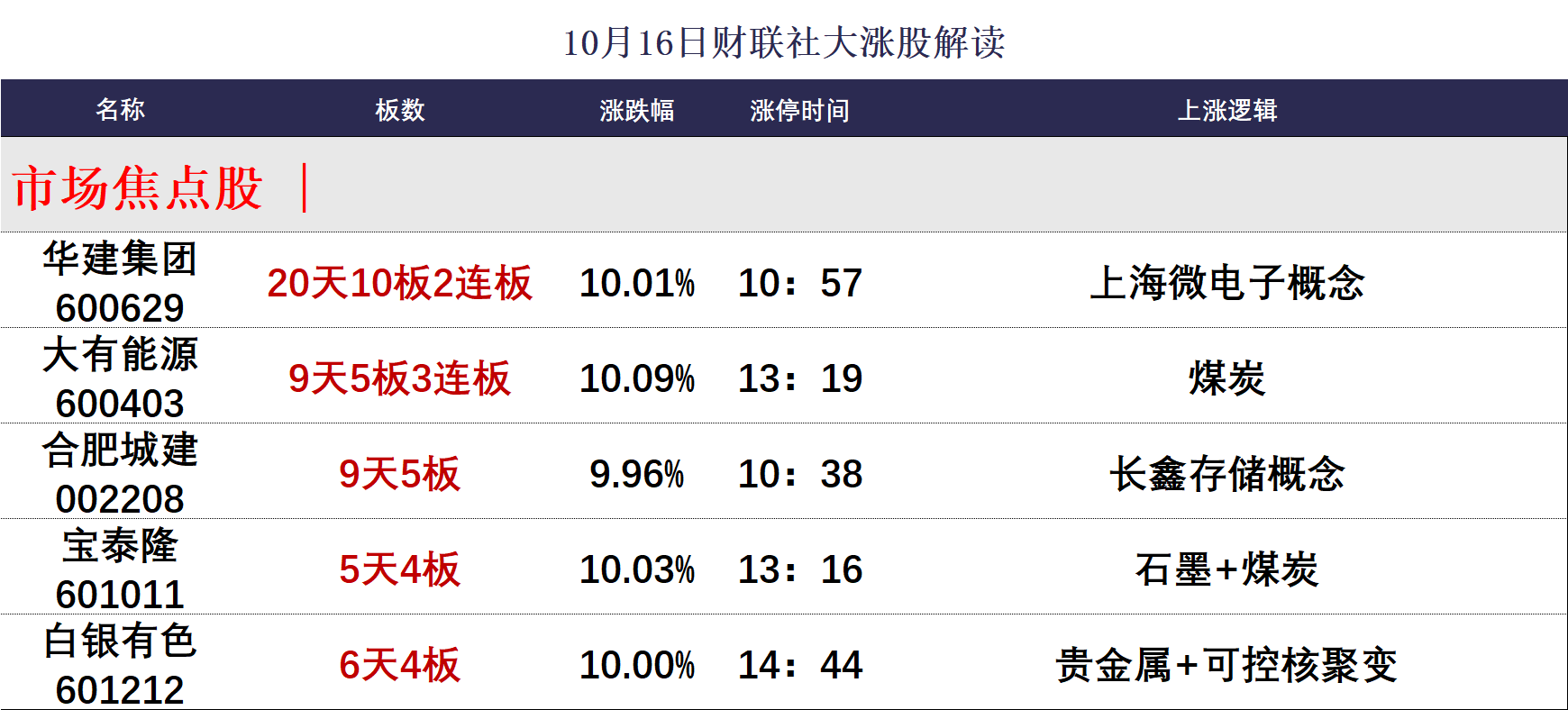 财联社10月16日讯,今日40股涨停,18股炸板,封板率为69%,远大控股亚太药业新农股份3连板,华建集团20天10板,大有能源合肥城建9天5板,宝泰隆5天4板,白银有色6天4板。市场冲高回落,三大指数盘中一度集体翻绿。沪深两市成交额1.93万亿,较上一个交易日缩量1417亿,自9月10日以来再度失守2万亿。板块方面,煤炭、保险、港口航运等板块涨幅居前,贵金属、半导体、风电等板块跌幅居前。截至收盘,沪指涨0.1%,深成指跌0.25%,创业板指涨0.38%。