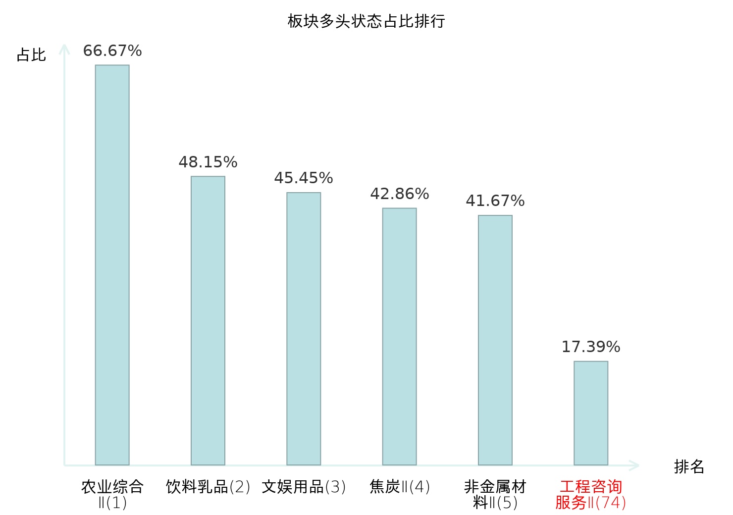 全市场所有行业板块中主力多头状态占比排名中,农业综合Ⅱ板块位居第一。特钢Ⅱ板块名次提升最快,较昨日上升46位。