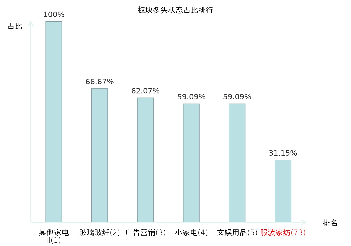 全市场所有行业板块中主力多头状态占比排名中,其他家电Ⅱ板块位居第一。消费电子板块名次提升最快,较昨日上升54位。