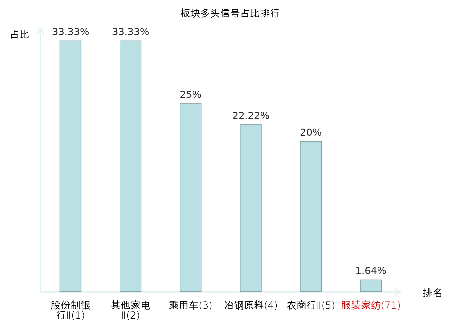 全市场所有行业板块中主力多头信号占比排名中,股份制银行Ⅱ板块位居第一。股份制银行Ⅱ板块名次提升最快,较昨日上升118位。