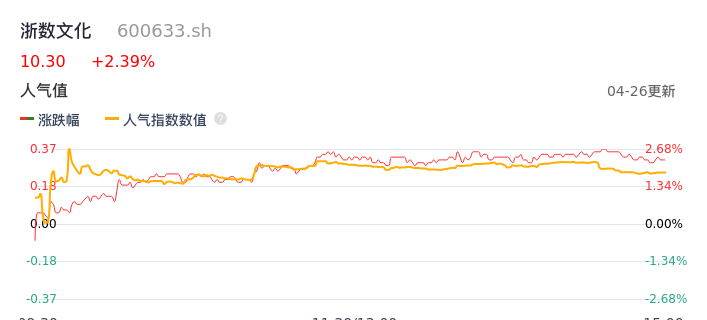 04月26日,浙数文化收报10.30,股价涨幅2.39%,成交金额1.86亿元,换手率1.43%。